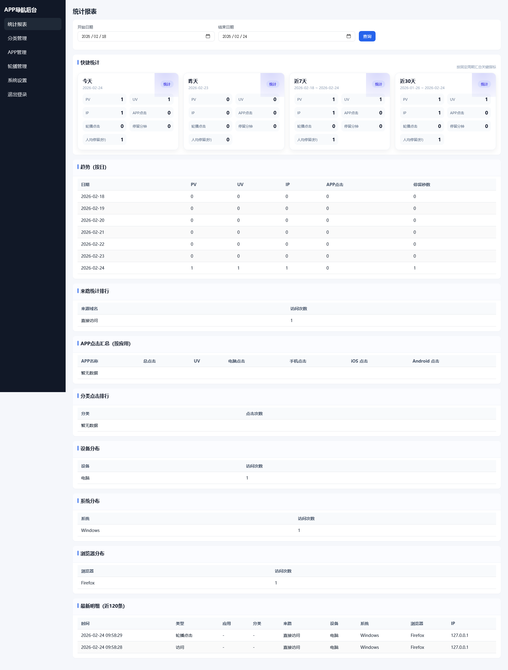WAP 自适应的 APP 下载导航单页程序,支持分类、APP、轮播图与系统设置等后台管理。 内置完整统计体系(PV/UV/IP、来路排行、APP 点击与设备/系统维度),支持明细 2 天自动汇总与清理