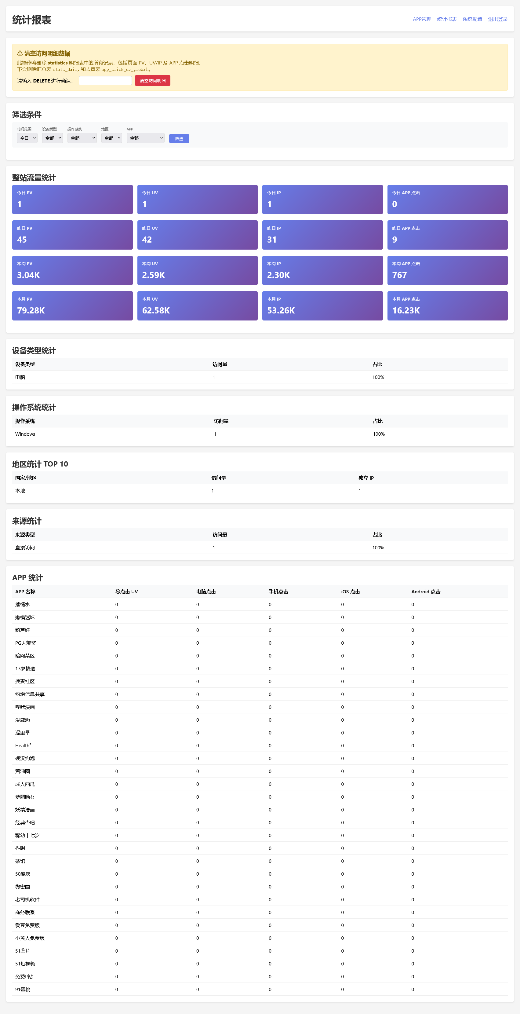 这是一个基于 PHP + SQLite 的轻量级「APP 导航/下载页」程序,主要用于展示多个 APP 下载入口,并统计访问与点击数据,配套简单后台管理。